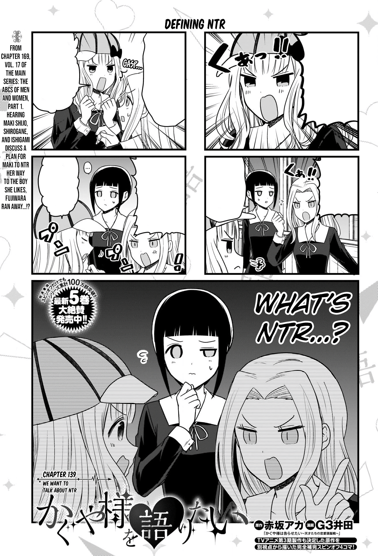 We Want to Talk About NTR is the one-hundred thirty ninth chapter of Kaguya-sama wo Kataritai.